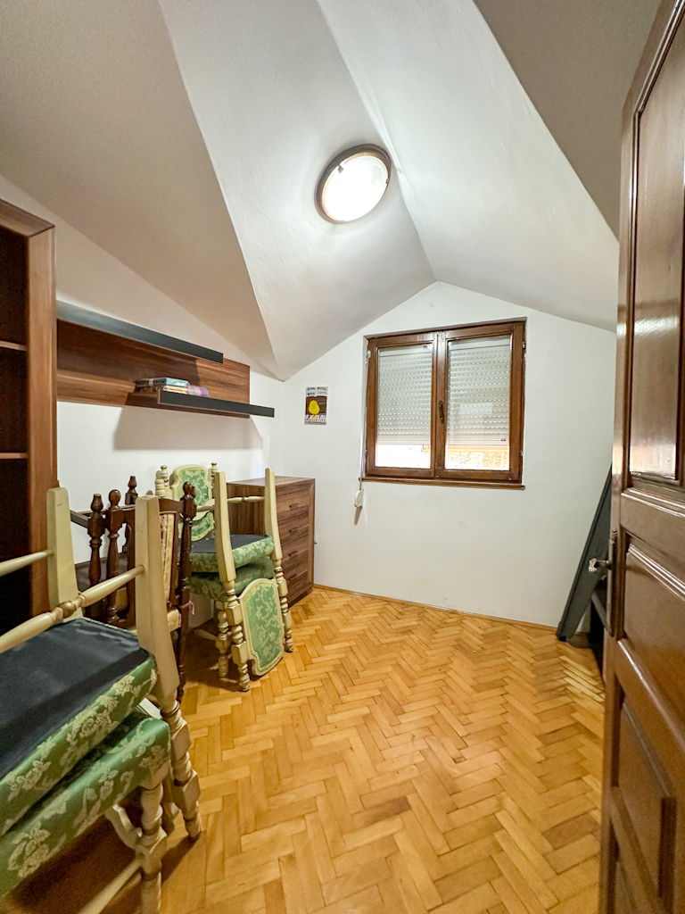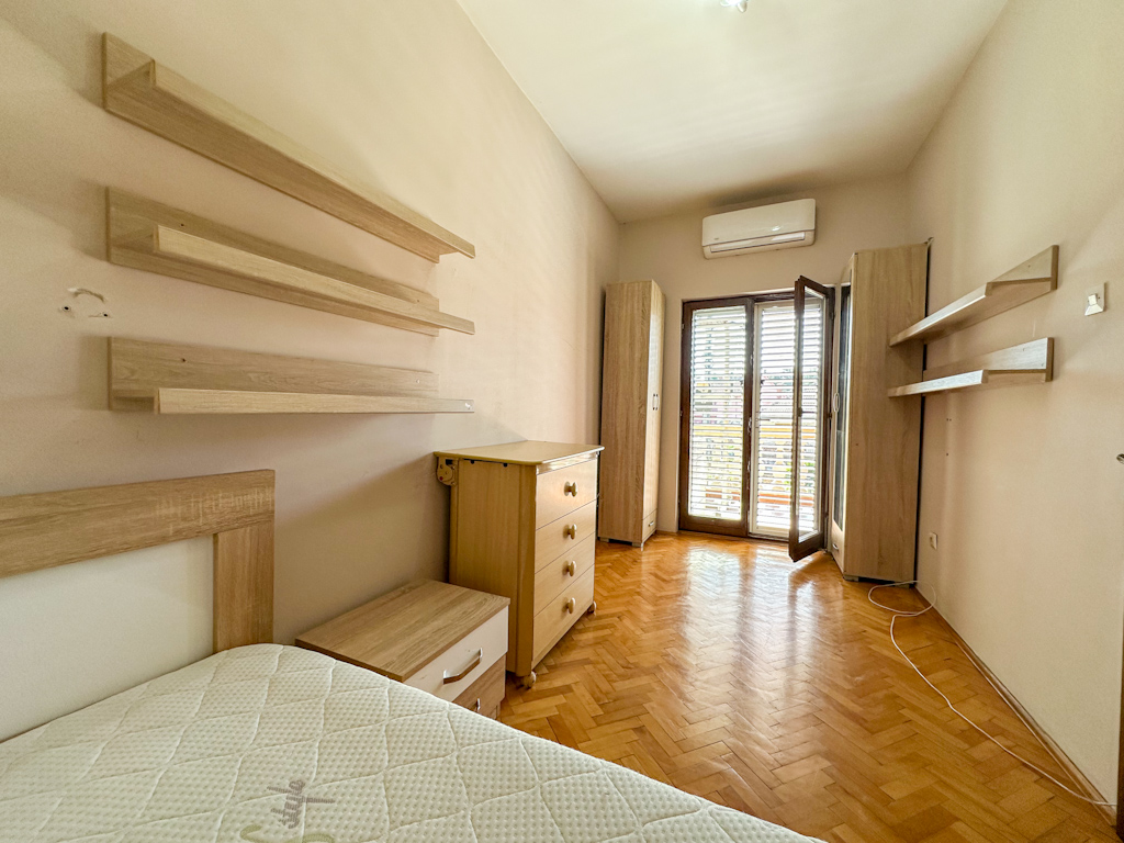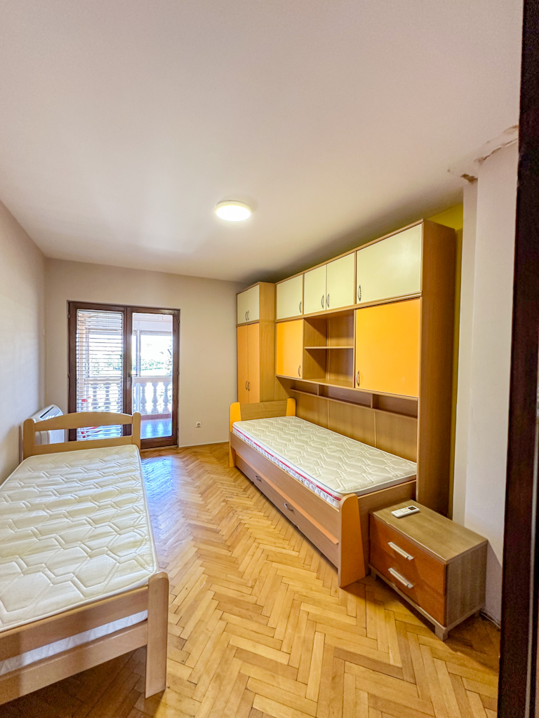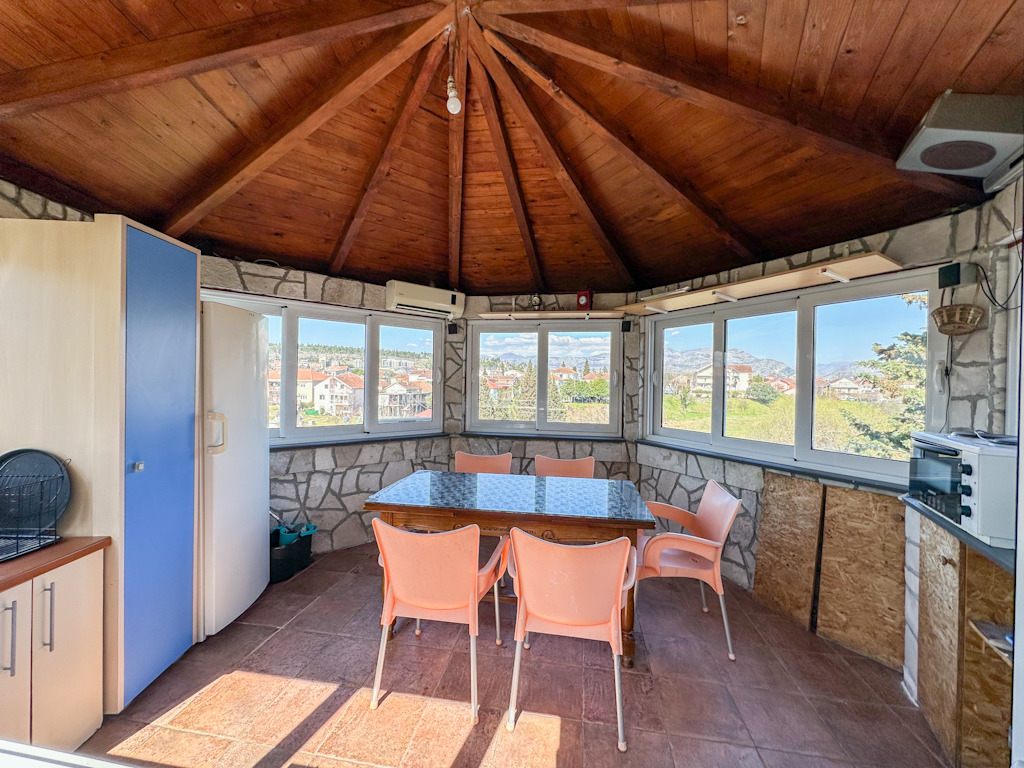 Izdaje se dvospratna kuća površine 220 m² sa 5 soba i garderoberom, 2 kupatila i 4 terase. Kuća posjeduje kamin, multisplit sistem grijanja i hlađenja, kao i video nadzor.