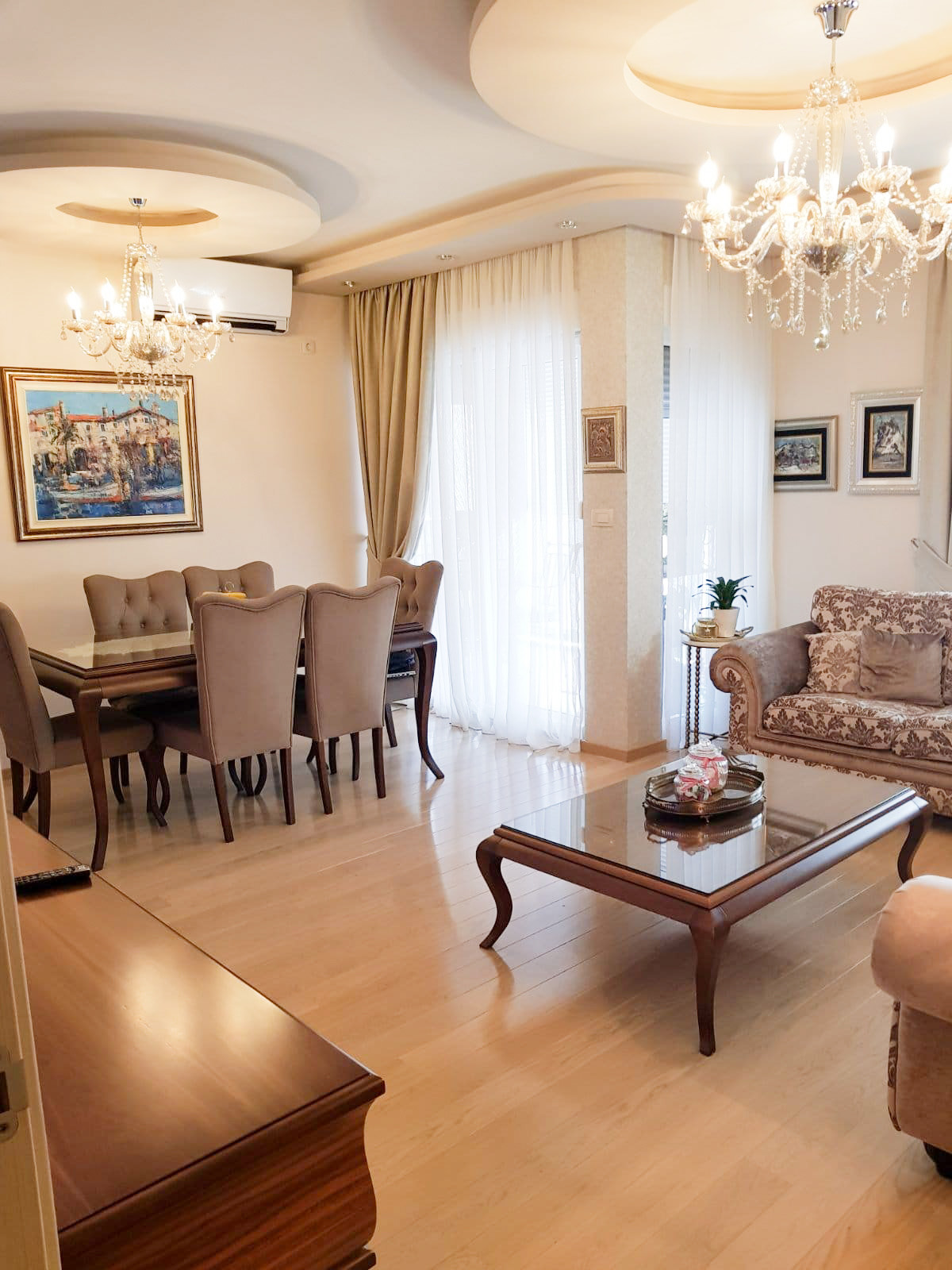 Luksuzno opremljen, moderan i izuzetno funkcionalan stan — sastoji se od prostranog dnevnog boravka sa kuhinjom i trpezarijom, tri spavaće sobe, dva kupatila, tri terase i ostave.